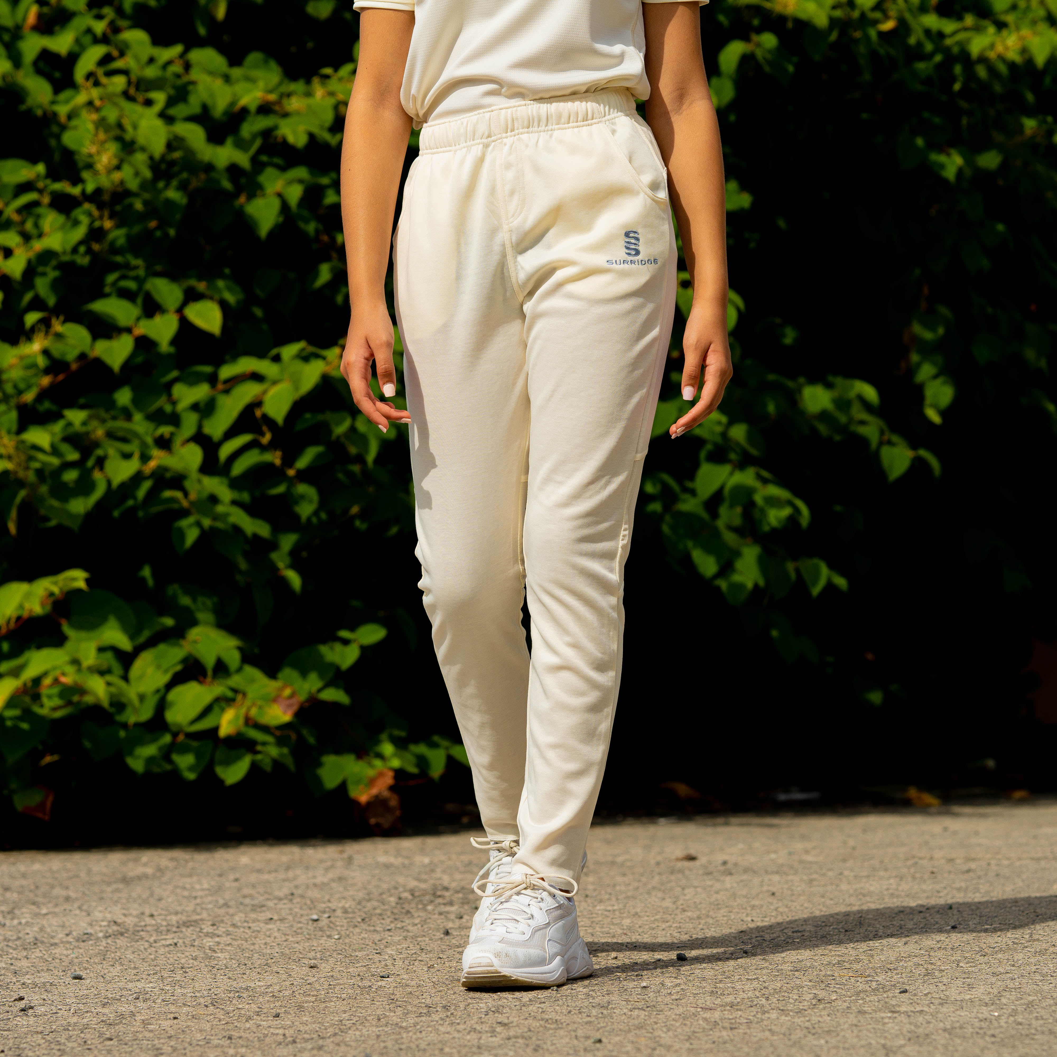 Tek Playing Pant, embroidered ss left leg in silver.  Made from a slightly fleecey internal material, with tapered legs from the knee downwards.  Comes in an unfinished leg with 2 pockets.  Elasticated waistband with draw cord.  Specifically designed for he modern women cricketer.